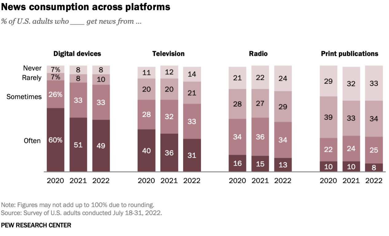 Still, digital devices continue to outpace TV, Pew said, as the latter has seen its usage of it often drop as a source for news consumption from 40% in 2020 to 31% in 2022.