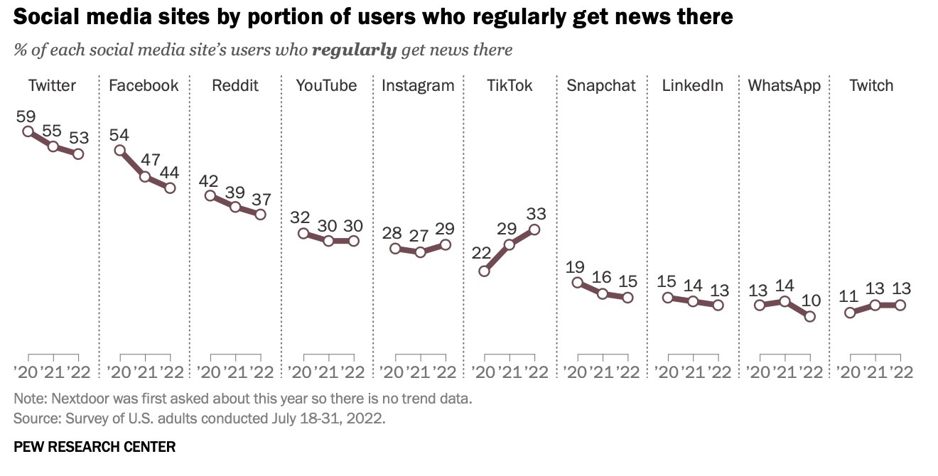 Meanwhile, nearly every other social media site saw declines across that same metric — including, in particular, Facebook, where now only 44% of its users report regularly getting their news there, down from 54% just two years ago.