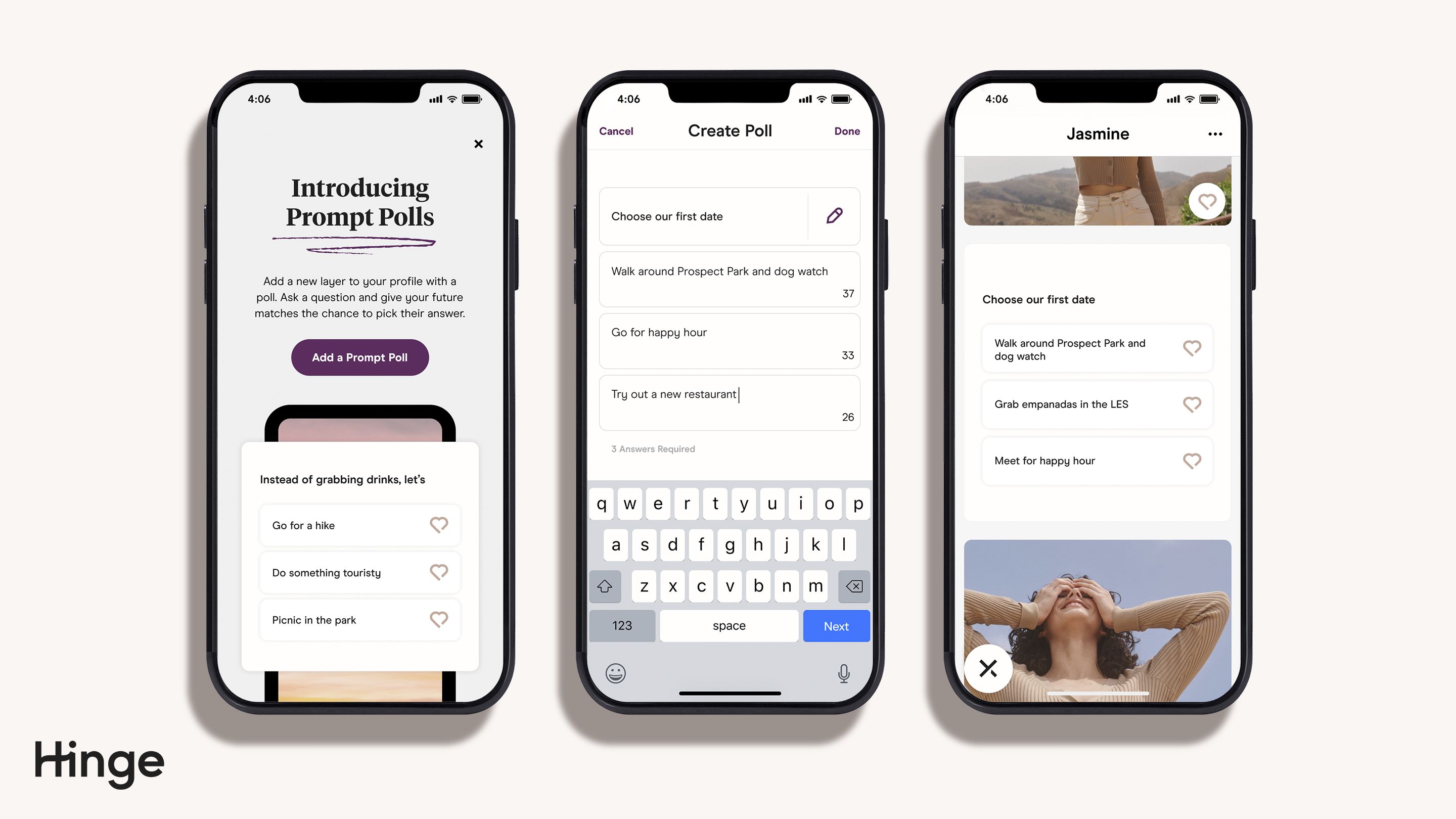 With the addition of “Prompt Polls,” Hinge hopes that daters can have better conversations by asking potential matches questions they want to know about them.