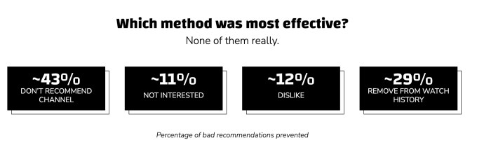 The organization’s study observed that YouTube served them with videos similar to what they had rejected — despite people using feedback tools or changing their settings. When it came to tools preventing bad recommendations, clicking on “not interested” and “dislike” was mostly ineffective as it only prevented 11% and 12% of bad recommendations, respectively. Methods like “don’t recommend channel” and “remove from watch history” ranked higher in effectiveness, cutting 43% and 29% of bad recommendations, respectively. Overall, users who participated in the study were dissatisfied with YouTube’s ability to keep bad recommendations out of their feeds.