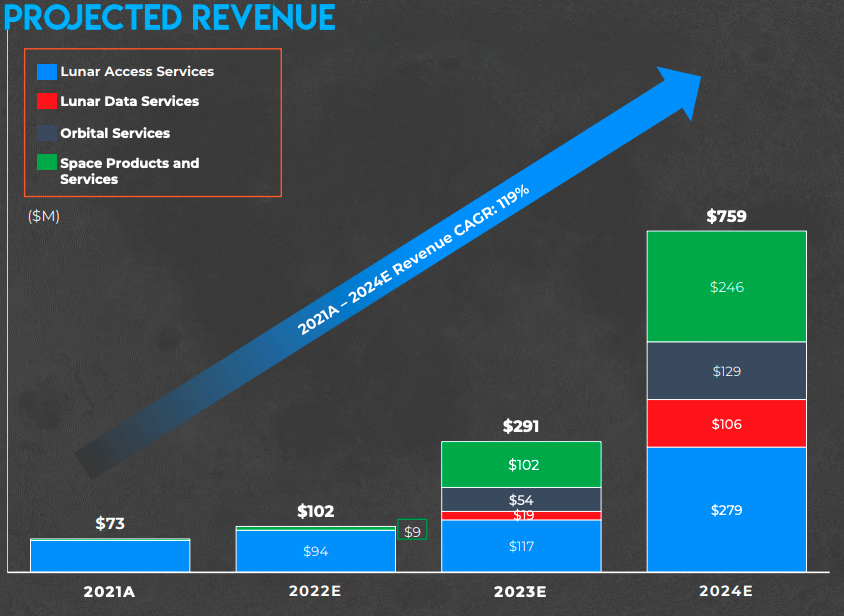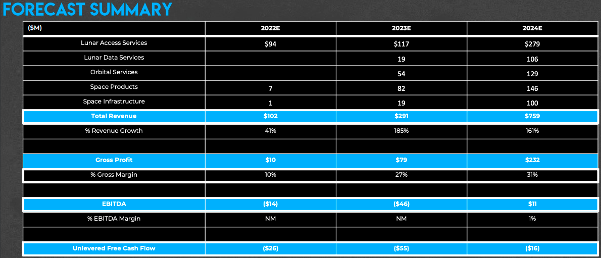 Looking ahead, Intuitive Machines expects revenue to grow somewhat modestly in 2022 to $102 million, and then scale rapidly from there as other business categories pick up traction: