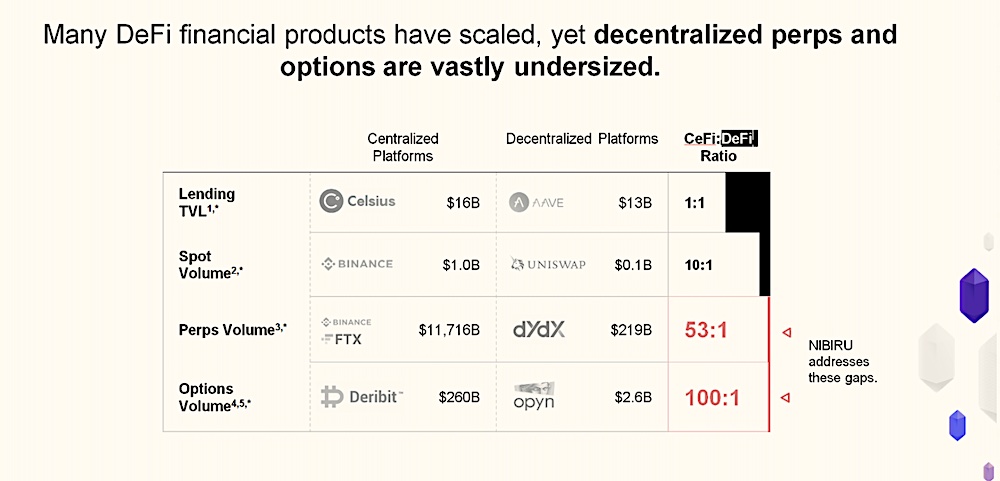 On its investor deck, Nibiru says it will provide customers with unlocked hedging opportunities, extremely low gas costs, MEV resistance and high futures volume. It is also creating composable yield in rising/falling regimes using decentralized perps and options, the deck added.