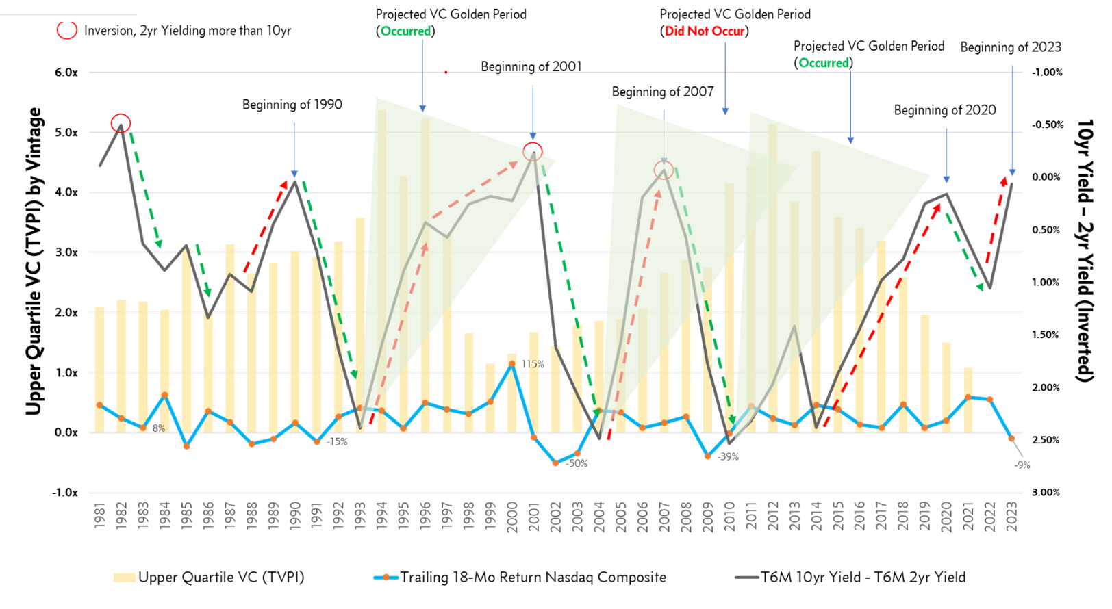 These are periods where the top-quartile VC TVPIs exceed 4.0. They tend to occur three to four years after a yield curve inversion or near inversion. The typical trigger point occurs when the 10-year yield exceeds the two-year yield by about 2.5% (i.e., 1993, 2004, 2010). For instance, a yield curve near-inversion occurred in late 1989/early 1990. The yield spread then stretched back to about 2.5% by 1993, and the 1994 VC vintage went onto deliver a 4.0+ TVPI along with the 1995 and 1996 vintages.