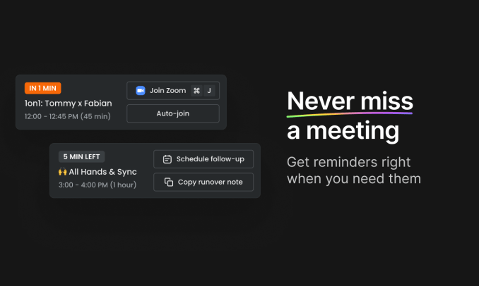 You can quickly join the meeting from that page with a CMD/Ctrl + J shortcut or get a popup reminder to join a minute before the meeting starts. What’s more, the tool also reminds you to wrap up your meeting on time so you can move on to other tasks.