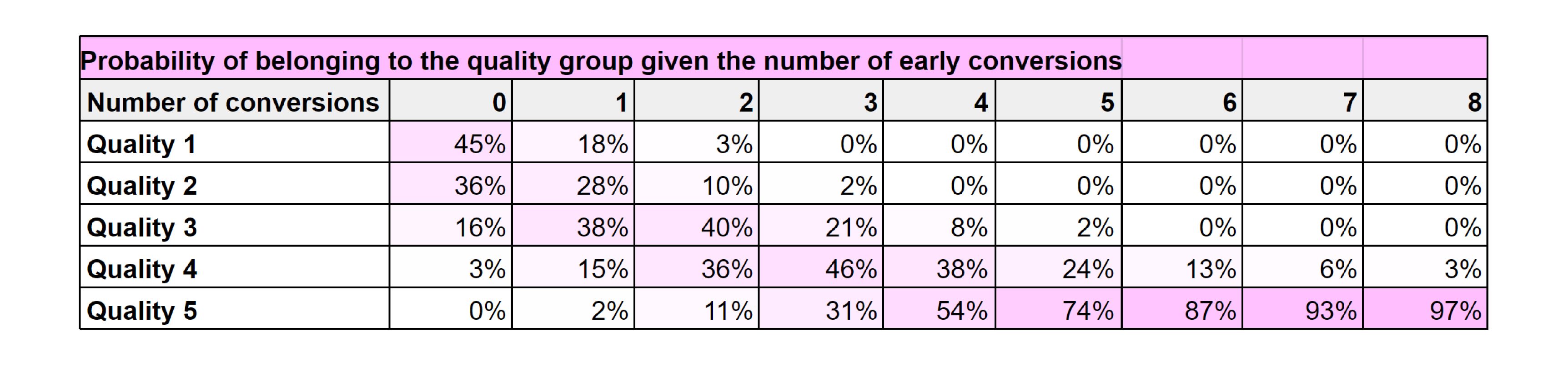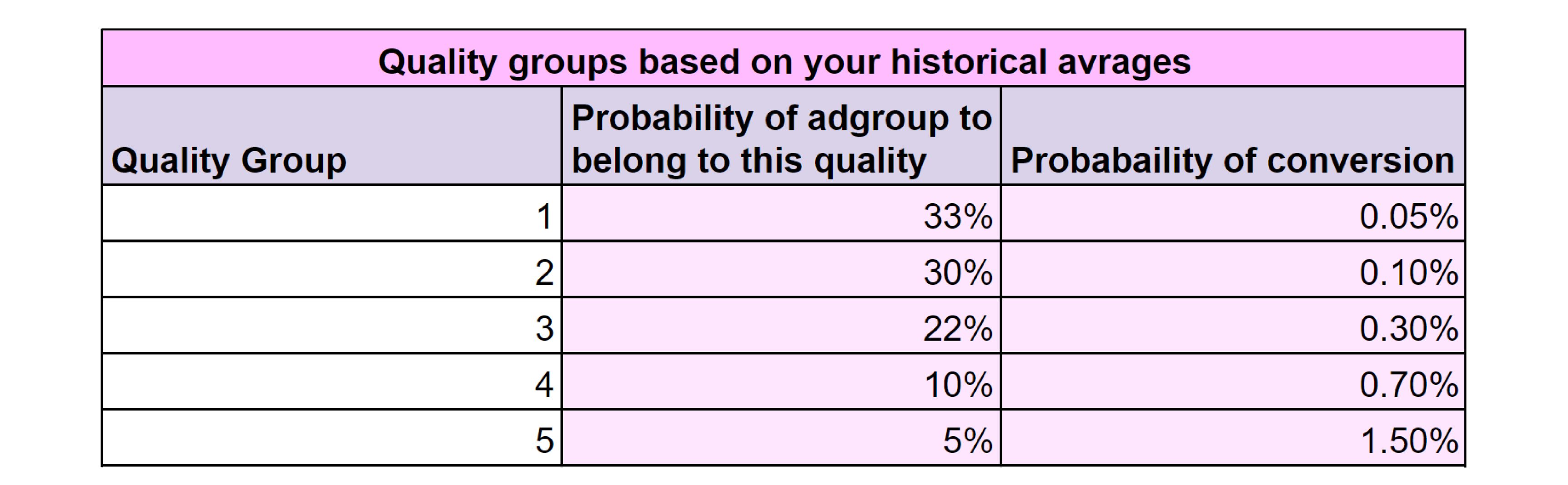 In our example (using the data we entered in steps 1 and 2), if the ad group generated two conversions to date, it’s most likely to belong to quality group 3 (40%!). If it generated three conversions, it will rank in group 4 (46%!).