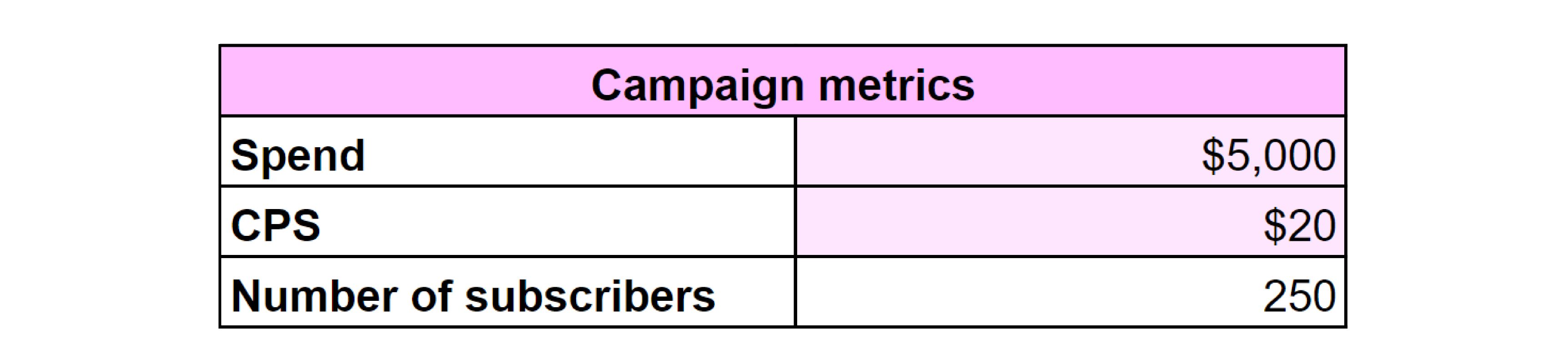 Fill in the performance metrics to date of the specific campaign or ad group’s cohort. You’ll want to fill in the spend and the cost per subscriber.