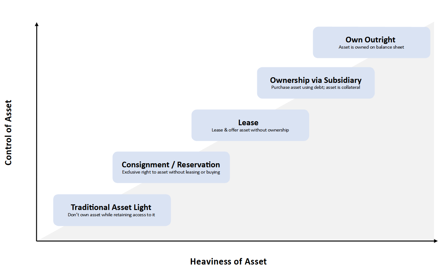 - Purchase the asset and put it on your balance sheet (this is maximally “asset-heavy”).