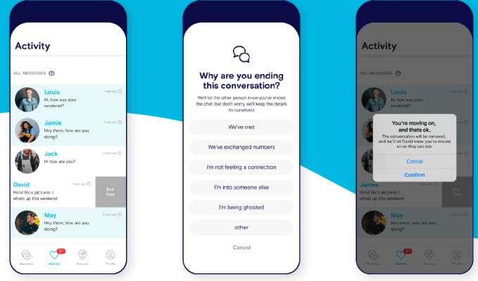 Users can swipe on the message to select “End Chat.” The app will then prompt them to choose a reason for ending the conversation — whether that’s because they’ve already met the person, just not feeling it, into someone else, or other reasons. Users can also end the conversation because they think they are being ghosted. The other match will be notified that the conversation has been closed and why.