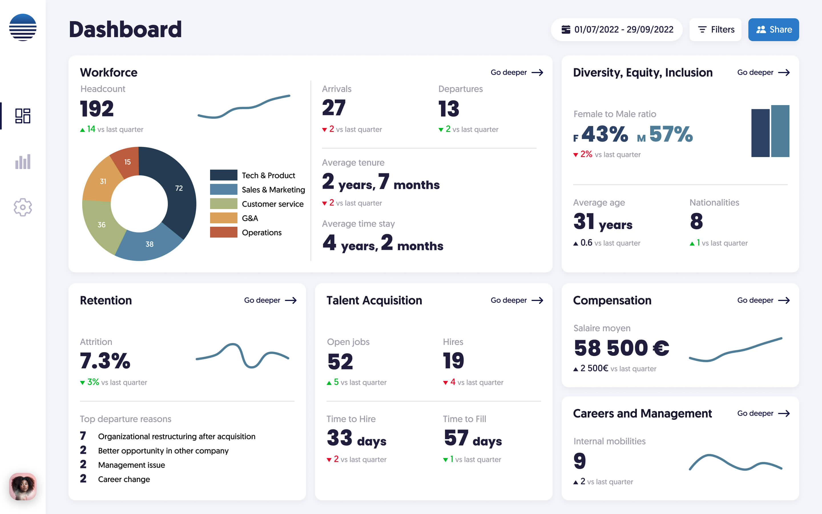 Some companies already have a data visualization tool like Tableau and Power BI. But the issue is that HR departments deal with sensitive info, like salaries and sick leaves. You don’t want to grant access to your HR data to the entire company.