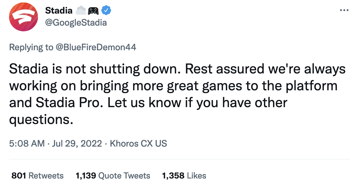 The last first; it was only two months ago that Stadia’s Twitter account assured a concerned user that the service was not in fact shutting down.
