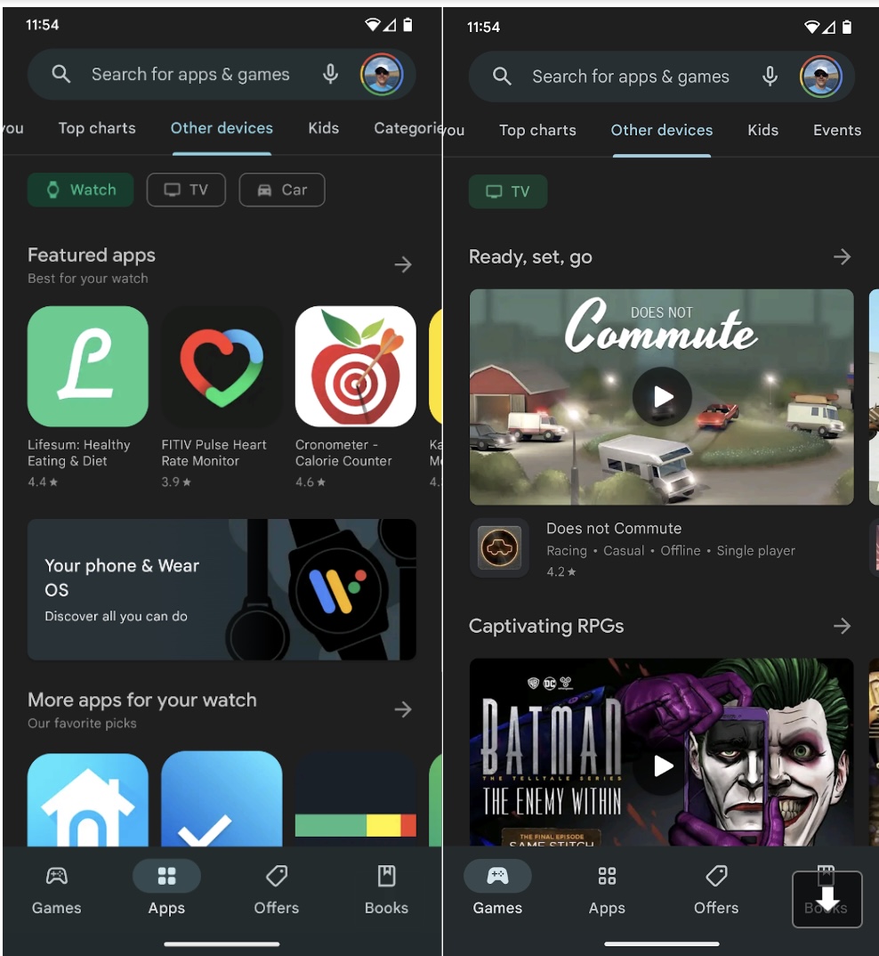 - Google officially announced the Play Store reorg that has been rolling out for some days. The changes make it easier to filter for and remotely install non-phone apps, including those for watches, tablets, cars and smart TVs.
