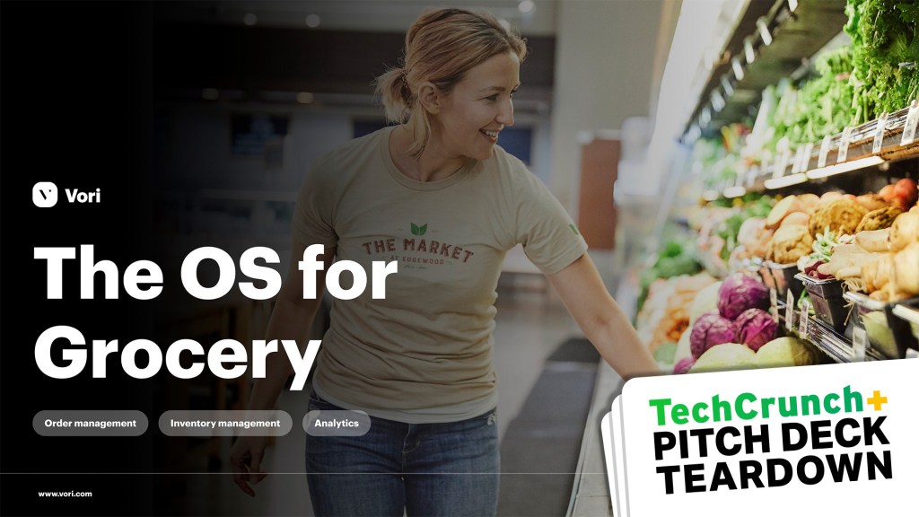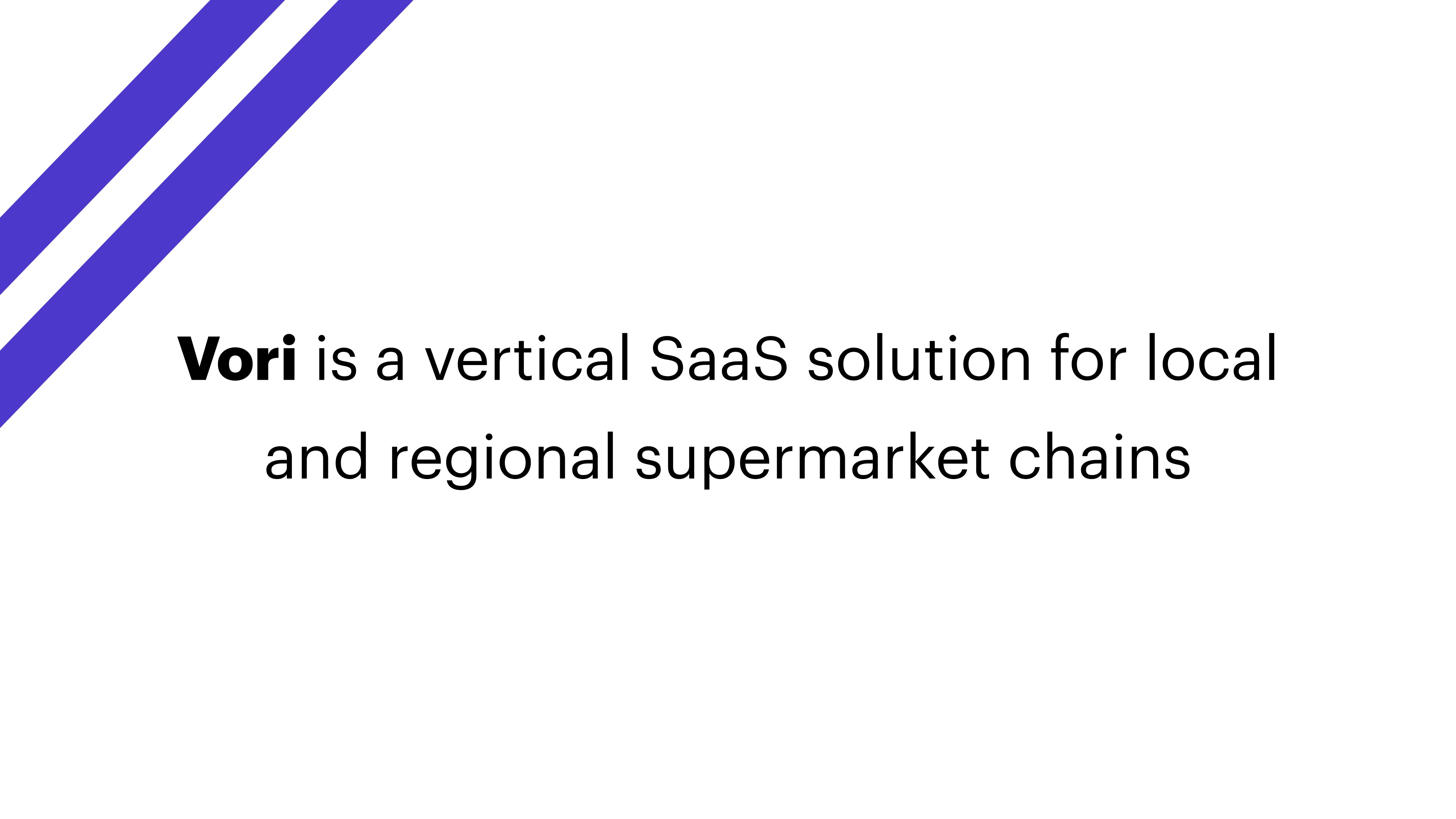 I love a good summary slide. A lot of people put it on the cover slide, but Vori takes a different approach — the first two slides set the stage for what the company is doing. The cover slide is at the top of this post and just reads “The OS for Grocery” with a few keywords, designed as tags (“order management,” “inventory management” and “analytics”). The second slide further rounds out the level-setting for what the company does: “Vori is a vertical SaaS solution for local and regional supermarket chains.”