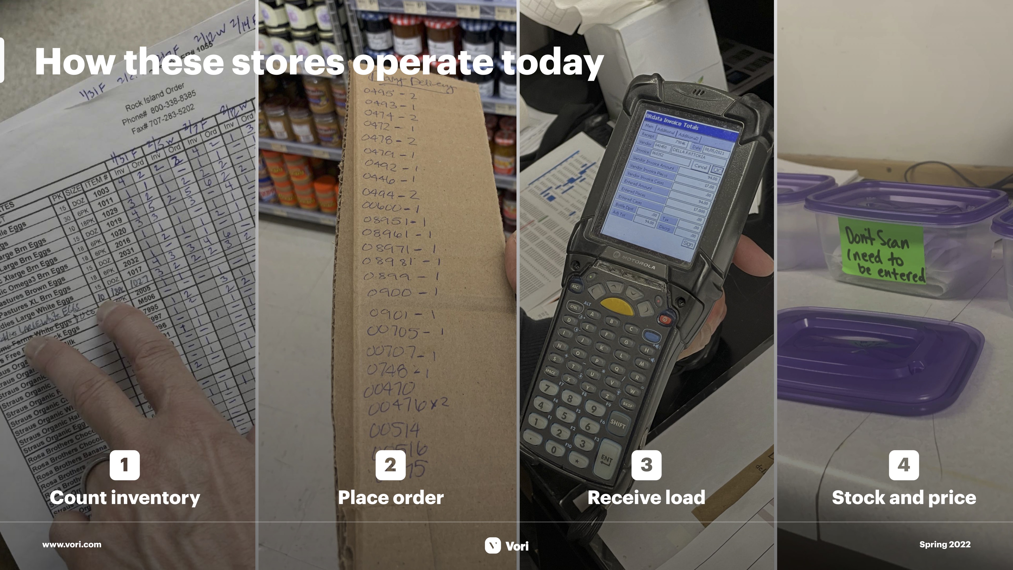 - “Meet Vori, the all-in-one grocery back office” — solution slide