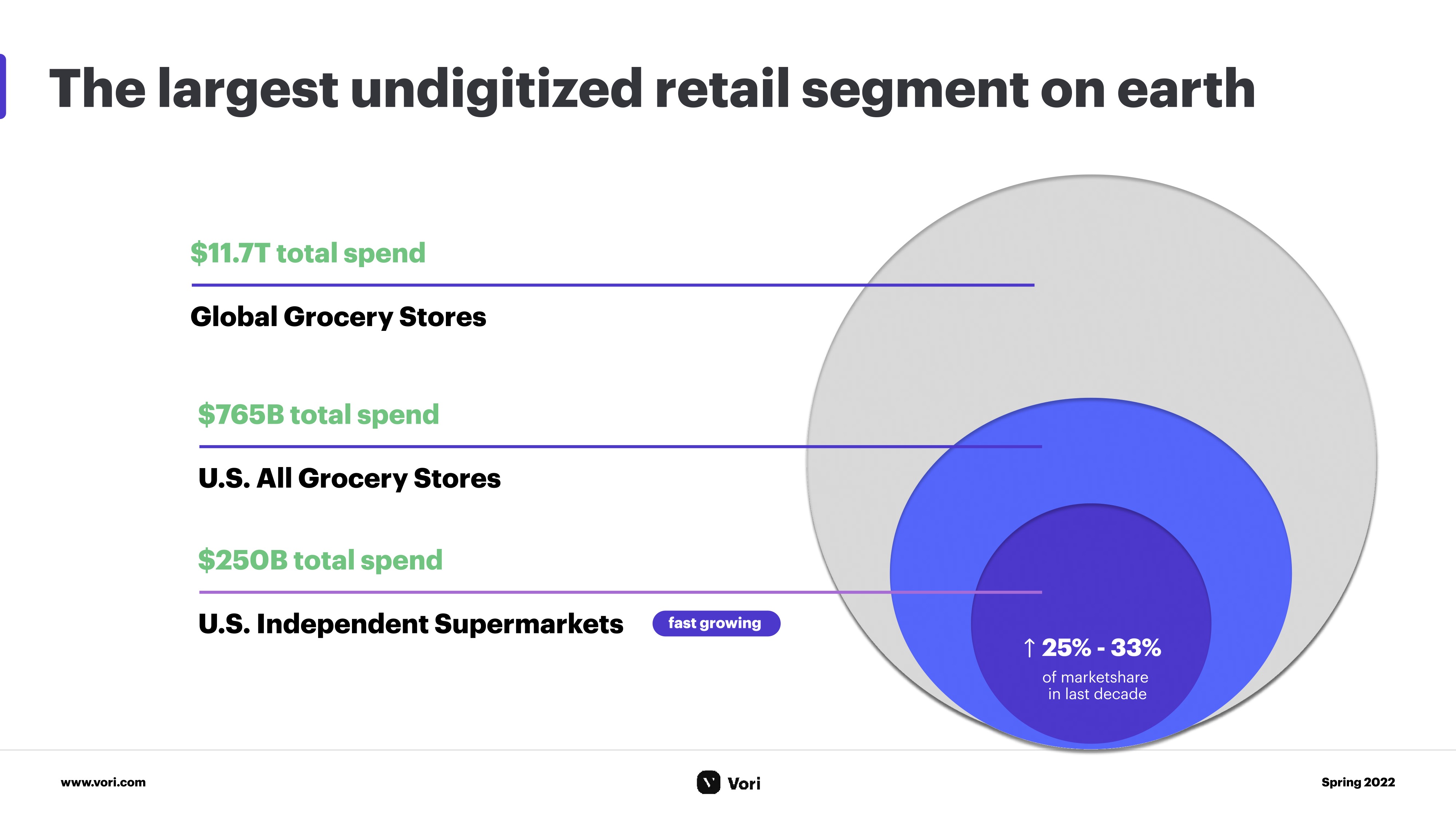 In this slide, Vori talks about “the largest undigitized retail segment,” which is likely correct, but the $785 billion of total spending in the U.S. isn’t the market size; this is the size of all spending by consumers in grocery stores. Statista has some interesting numbers there.