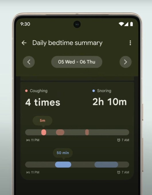 “With your permission, digital well-being can help you understand the quality of sleep by analyzing the audio from coughs and snores during the night. The processing happens right on your Pixel 7,” an exec said during the presentation.