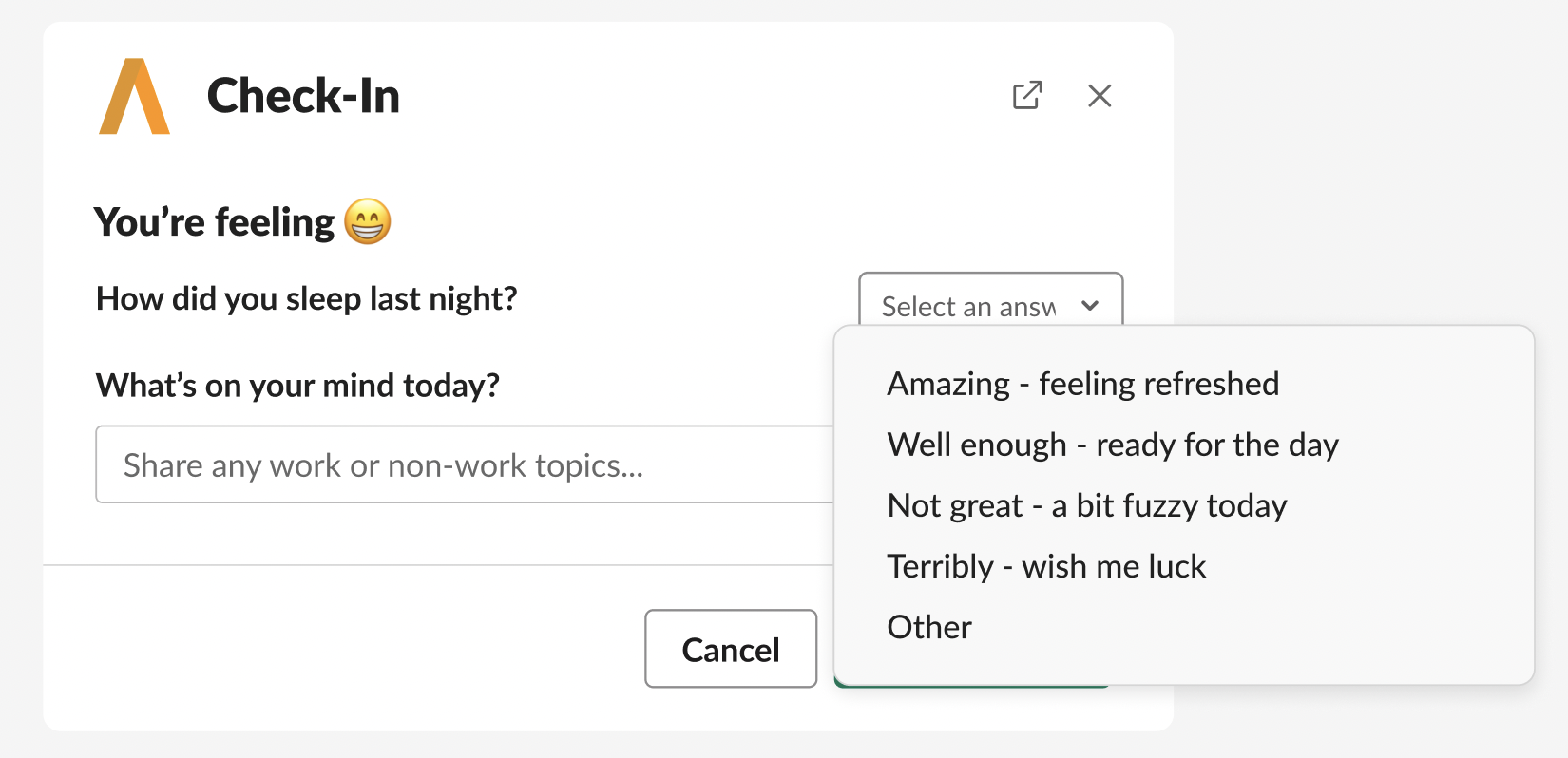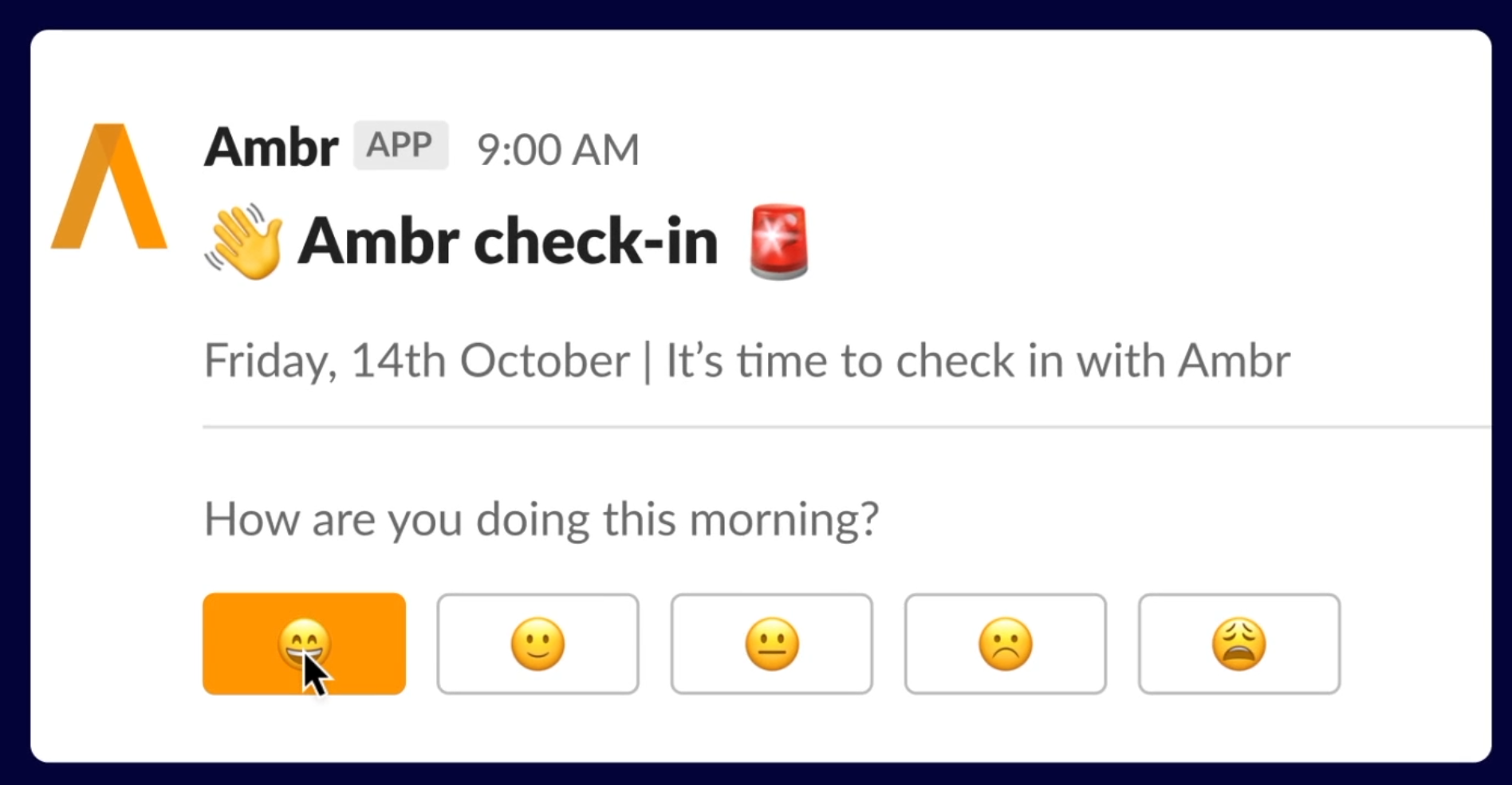 Ambr’s technology currently relies on self-reported check-in data from Slack, with a configurable survey-like system for gathering feedback from workers.