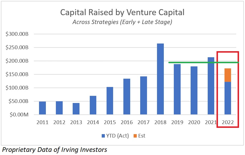 That’s 20% less than 2021 ($214 billion), a touch below 2020 ($180 billion) and about 11% less than the $194 billion average raised annually since 2019.