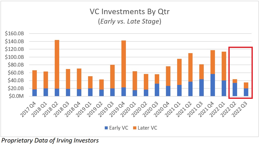 Total capital deployed by VCs in Q2 2022 and Q3 2022 has rapidly declined and now averages just $39 billion per quarter. This is on track to be the lowest reading since we can pull the data from 2017.