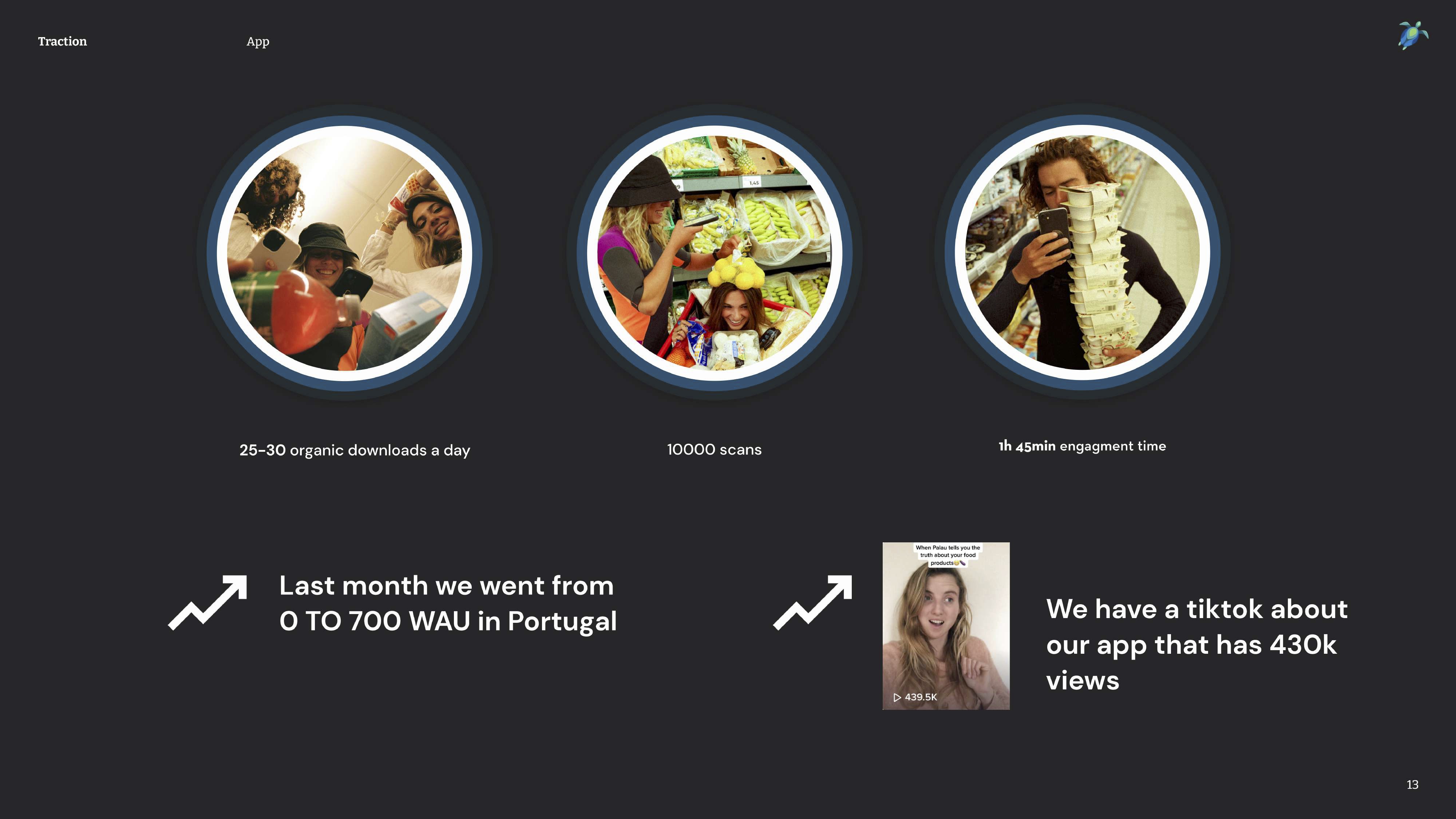 When a company is raising its first round, it’s unlikely that it has a product at all, never mind a product with actual traction. If you do happen to have such a product, scream about it from the rooftops. Having 30 downloads per day is impressive, and 10,000 scans shows that the app is working and getting some user engagement. Engagement time is cool, too — there are a lot of early indicators showing up here that the founders may be on to something. Going from zero to 700 weekly active users in a new market (Portugal) is impressive, too.
