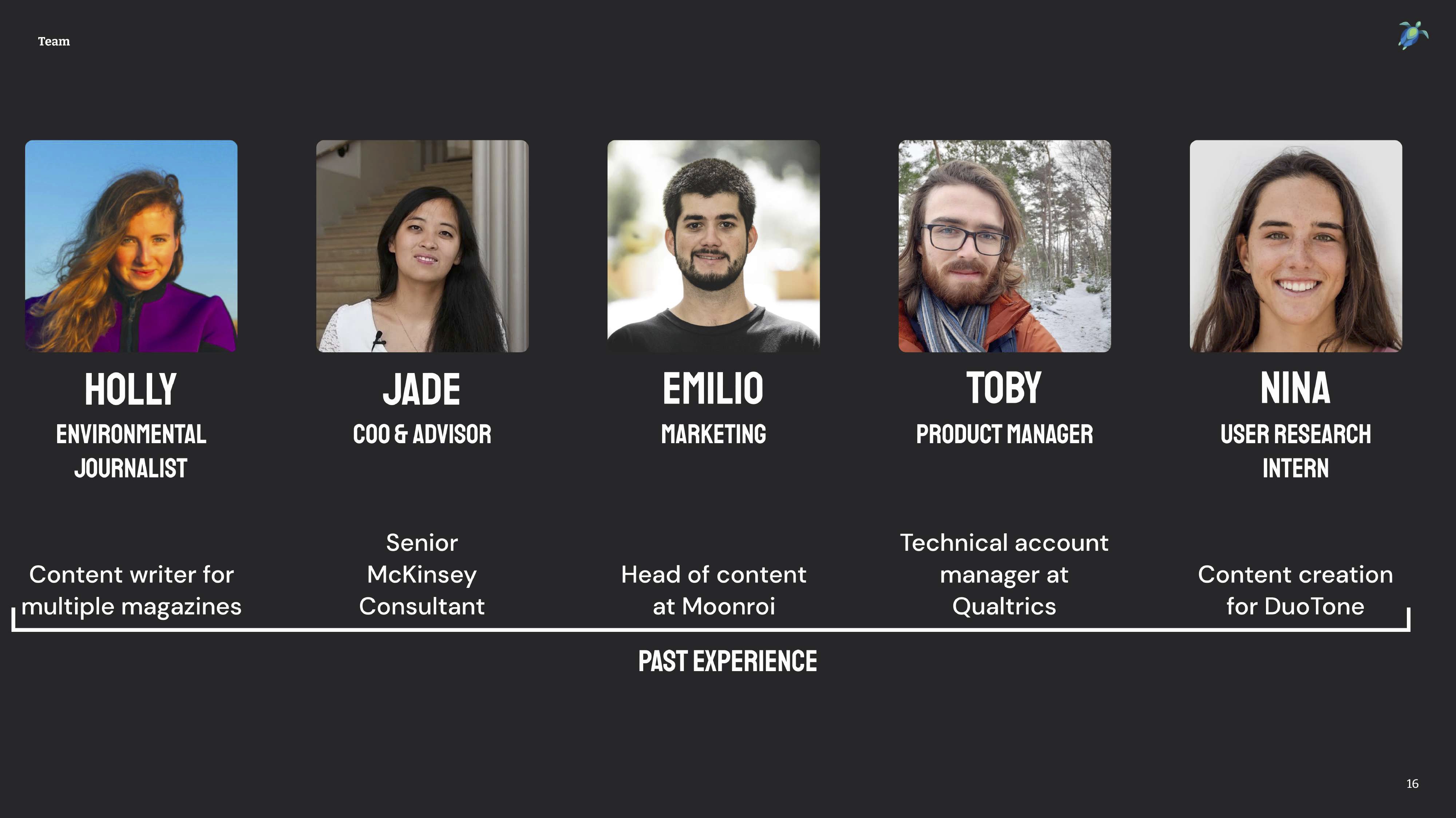 Finding the team information at the 16th and 17th slides in a 22-slide deck makes me think they aren’t very good, so that in itself could be a challenge. Putting the “team” slide before the “founder” slide seems like misplaced humility, too, and doesn’t make sense on a number of levels. Even if it did make sense, slide 16 does not dole out particularly impressive information: There’s an environmental journalist and a series of people from various work backgrounds. It’s unclear if they are contractors, full time, part time, how committed they are or how important they are to the future success of the company.