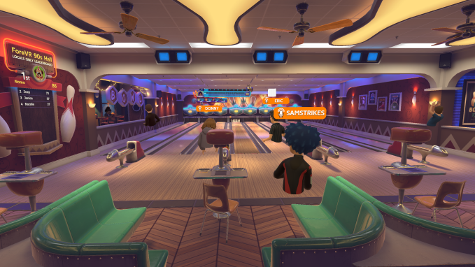 ForeVR games can be played single-player or multiplayer on the Meta Quest or Meta Quest 2. Players can unlock skins for their cornhole bean bags/boards, darts and bowling balls, listen to music through YouTube-powered jukeboxes, as well as explore different “halls” and bowling lanes, such as bowling in Atlantis or playing darts at a British pub.