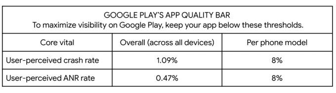 Specifically, it’s implementing new quality thresholds that will exclude apps that exceed certain crash rates and “app not responsive” (ANR) rates, both on an overall and per-phone model basis. Google says the apps that don’t meet these thresholds will be excluded from some areas of the Play Store, including recommendations, while others may even include a warning on their store listing to set appropriate user expectations.