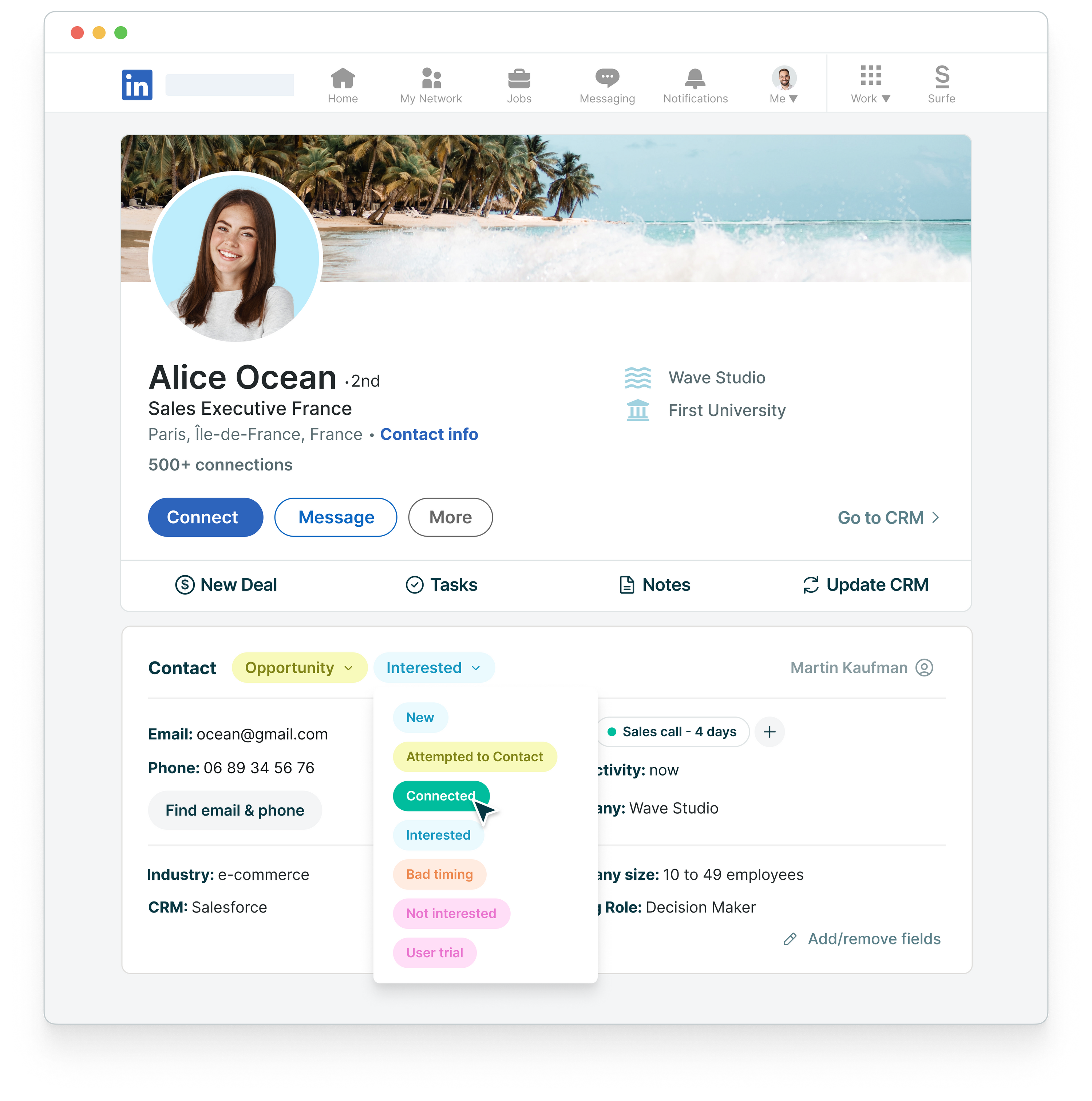 But it has evolved into a more powerful tool that provides two-way syncing. Surfe injects CRM data on LinkedIn directly so that you can interact with your CRM where you already spend most of your time.