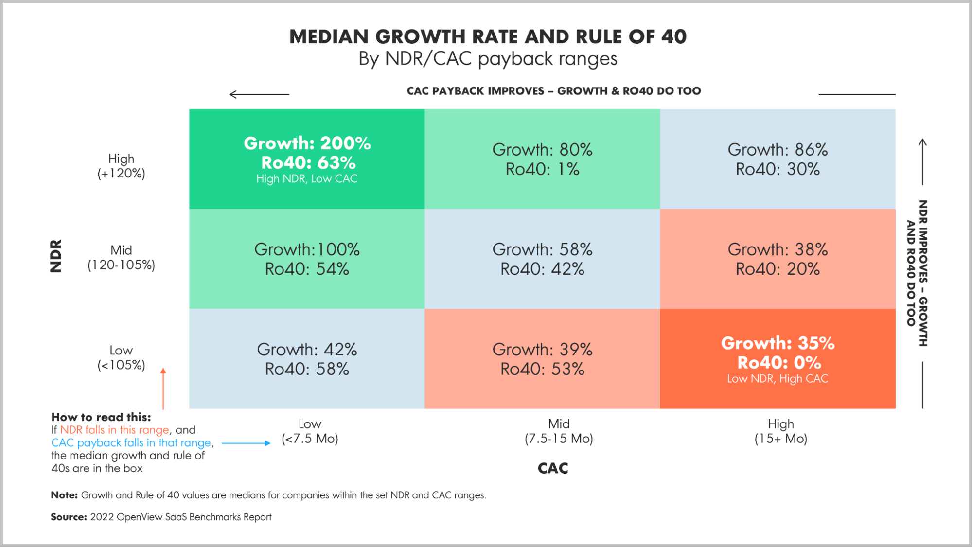 To both have outstanding growth and comply with the Rule of 40, it is necessary for SaaS companies to also have above-average NDR and a shorter CAC payback period, another metric that OpenView pays extra attention to. The graph below illustrates how this can pay off: