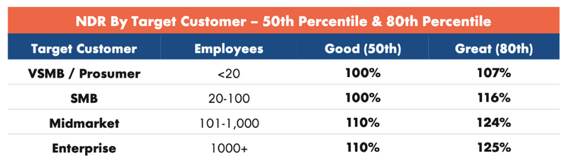 From the above, it is pretty clear that the NDR of best-in-class SaaS startups is correlated to the size of their target customers. As OpenView observed, “opportunities for growth within an account are much higher at larger companies.” Some startups are clearly better at leveraging this than their average peers. But even then, we are talking about 125% not 200%.
