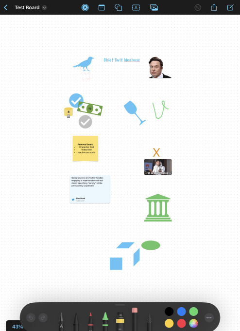 When you start Freeform on your iPhone, iPad or Mac, you’ll get a blank board. You can start sketching using different brushes that will let you adjust the color and opacity or just select the text box option and start writing. All the options for input are on the top, including sketching, text, notes, shapes and files.