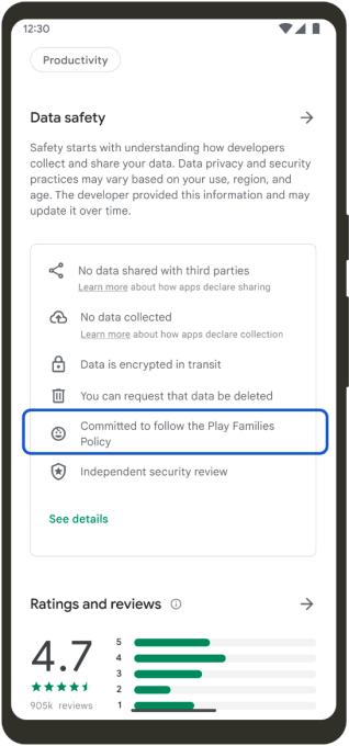 Consumers can find these Teacher Approved apps on the “Kids” tab of the Play Store or they can look for the Teacher Approved badge on an individual app’s listing. With the update, all apps that are compliant with the Families Policy will also soon receive an additional badge that’s displayed in the Data safety section of their app’s listing. This badge will indicate the app has committed to the Play Store’s Families Policy.