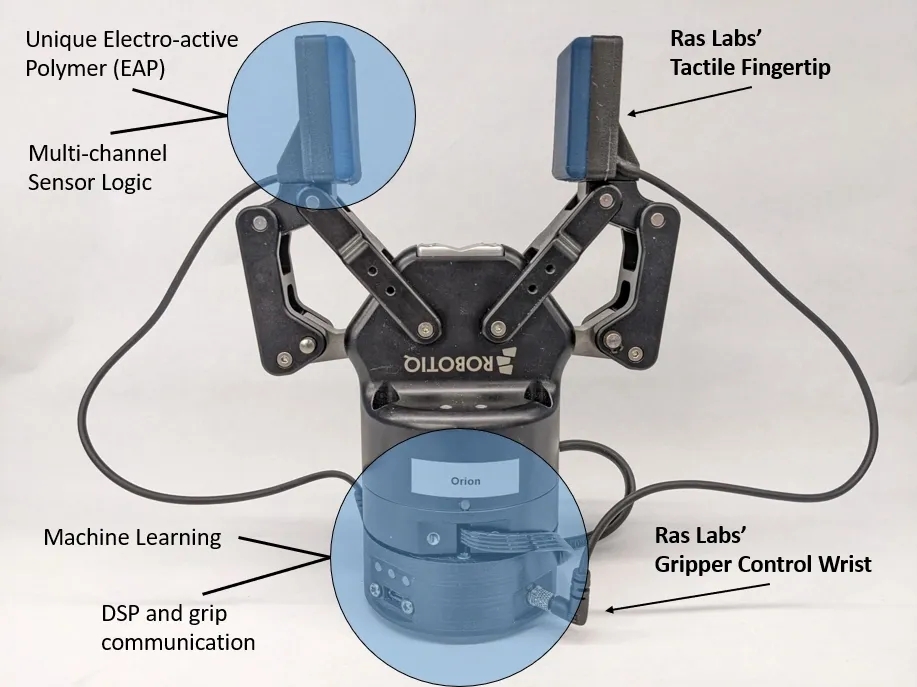 I also met with the small team at Ras Labs. Or I should say, I met with the small team at Ras Labs again. I didn’t realize until we started speaking that they were the brand-new robotic skin startup we spoke with on my last trip to Boston before the world exploded. The company builds a rubbery “fingertip” electroactive polymer (EAP) pad that brings pressure sensitivity to robotic grippers.