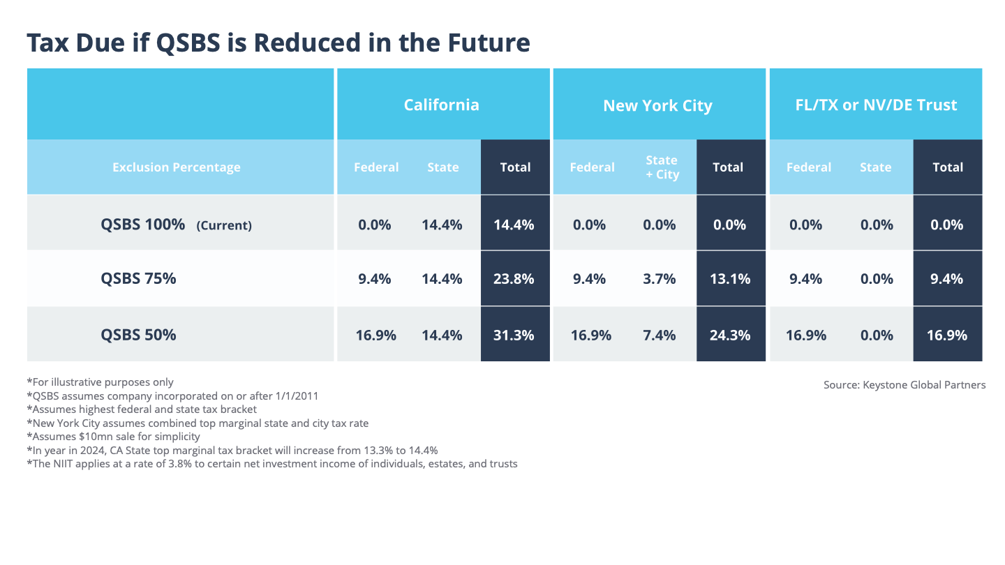 On one end of the spectrum, a founder in New York City, Florida or Texas who waits to sell until meeting the QSBS qualifications and holding period requirements could see a big after-tax difference. Assuming 100% QSBS exclusion, a founder in NYC who waits would pay essentially 0% in tax. Without waiting, the NY founder would pay 38.6% and the FL or TX founder would pay 23.8%. So, waiting to sell could be advantageous, provided all else remains equal.