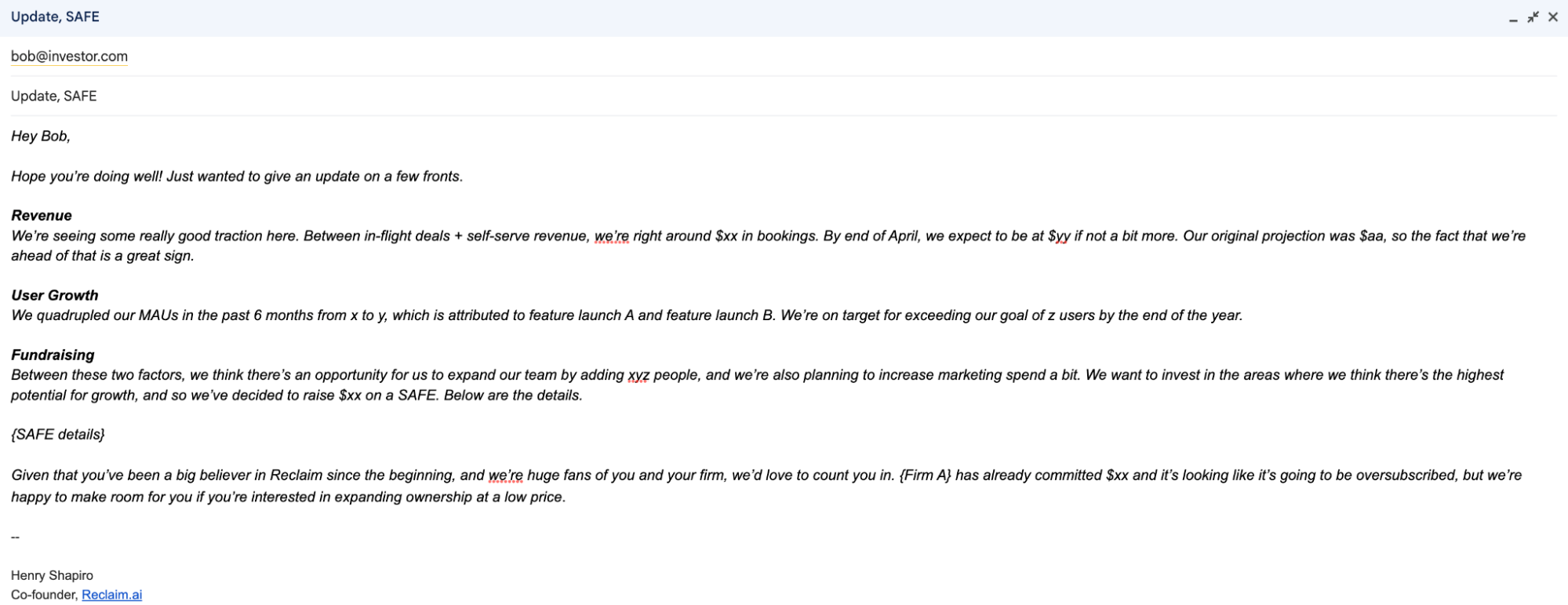 To do this, we first identified the people in our cap table who seemed most likely to be interested in expanding ownership based on their profile and relationship. Second, we used an instrument called a SAFE to help expedite the process and reduce due diligence pain. Lastly, we emphasized lightweight growth metrics instead of a full deck to keep the focus on a few key points.