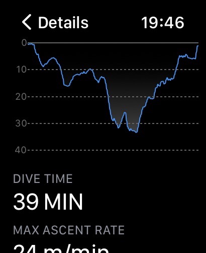 I brought my trusty old Suunto that has been with me on many a dive to serve as my secondary dive computer for these test dives. The readouts from the two dive computers were almost identical all the way through. The small differences can be attributed to having the Suunto in my pocket while the Apple Watch was on my wrist.