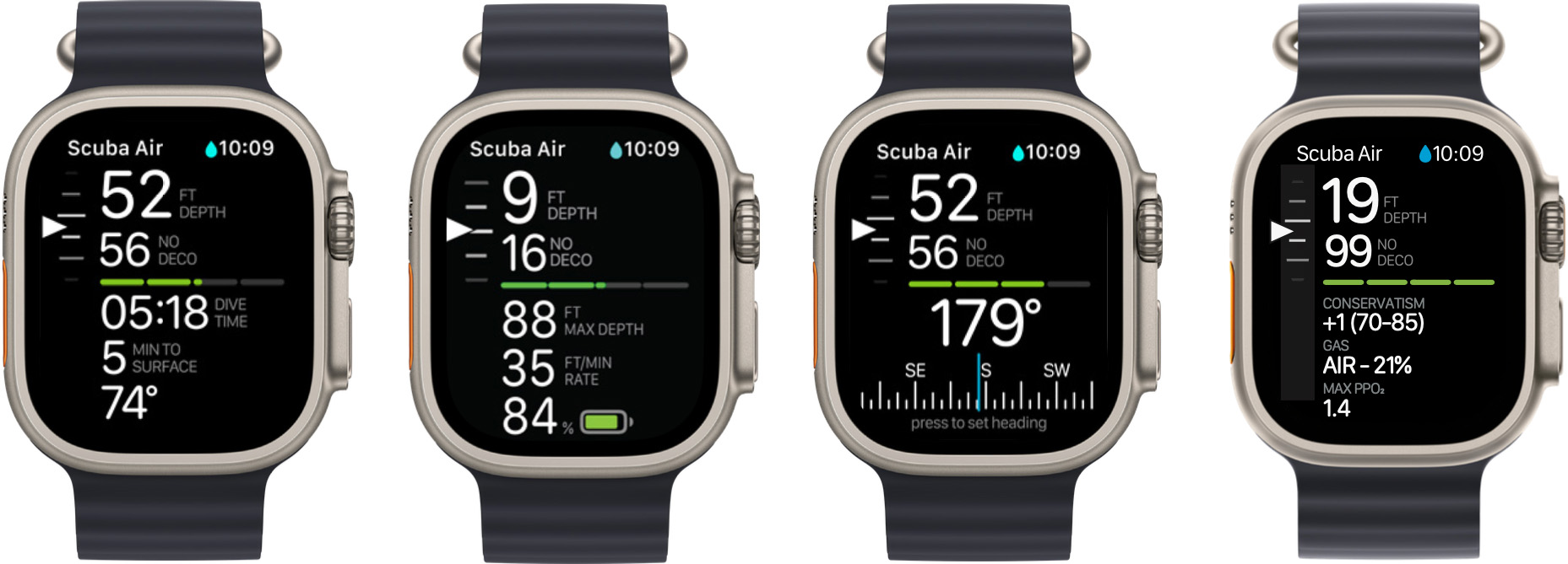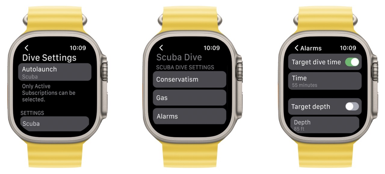 You can rotate the Digital Crown to access additional screens or press the Action button to set a compass heading. On the various screens, divers get access to a bunch of extra information.