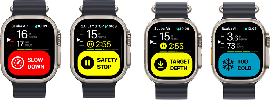 For instrumentation, Apple claims that the Apple Watch Ultra is EN13319-compliant; this is a European standard covering the “Functional, safety, and testing requirements” for “depth and time measuring devices.” In other words: dive computers. Apple Watch Ultra uses depth sensors that are accurate to 40 meters/130 feet. Typically, a newly certified scuba diver is licensed to 18 meters/60 feet, but most scuba diving training orgs will offer a “deep diving” specialty, which will allow divers to go to the full 40 meters/130 feet depth. Beyond that, you are looking at “technical diving,” which usually requires diving with other gas mixes. Things get complicated fast from here.