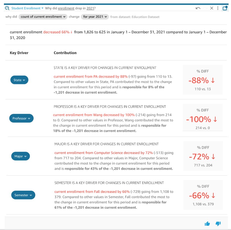 For example, if a graph shows that enrollment in a course dropped, the user might also want to know why it dropped. So they would start such a query with the word “why” and then follow it up with a metric and a timeframe. In this case, the question could be: “Why did enrollment drop in 2021?”