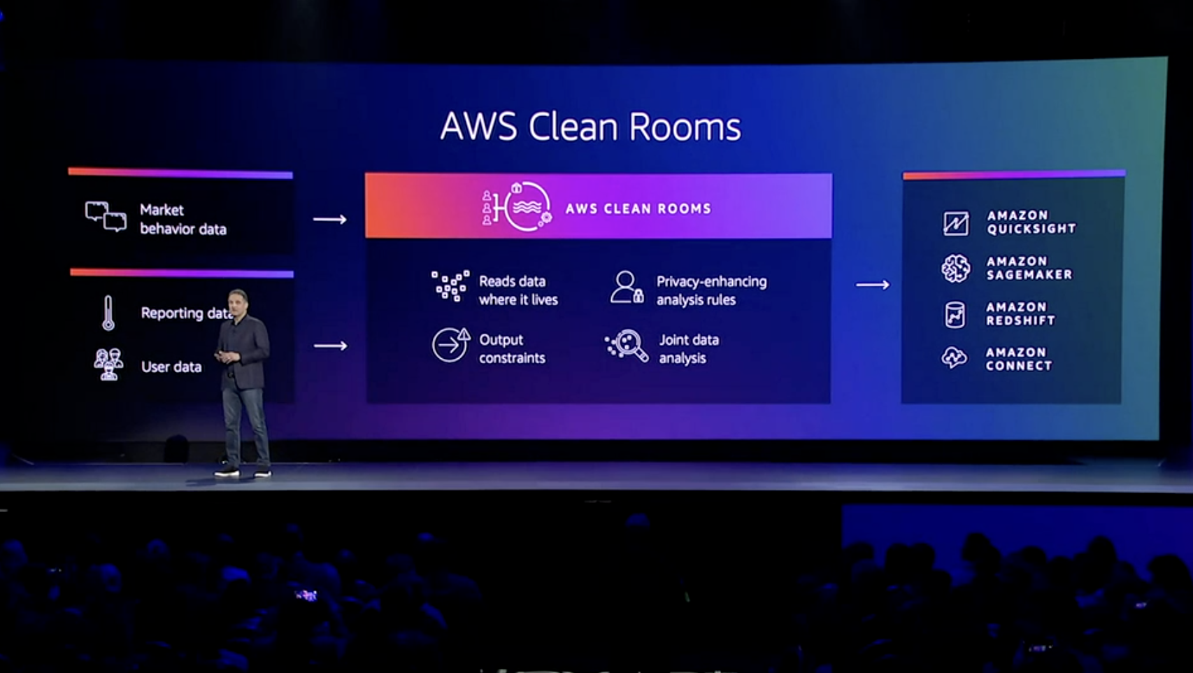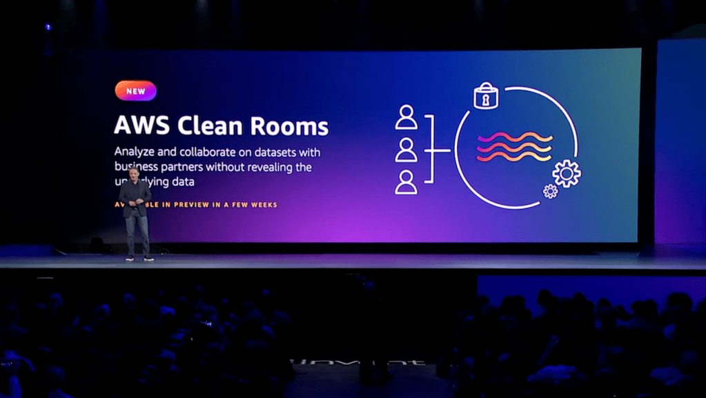“Data clean rooms are protected environments where multiple parties can analyze combined data without ever exposing the raw data,” AWS CEO Adam Selipsky explained in today’s keynote. “The clean rooms are hard to build. Their complex requirements take months to develop and once you’ve built a clean room you have to continuously update the data all the while meeting requests for new collaborators and data types.”
