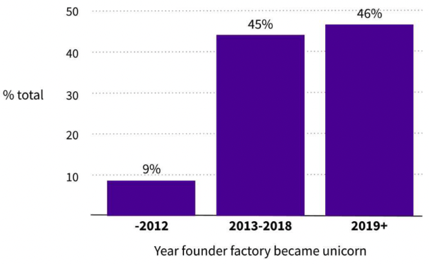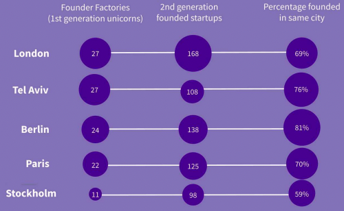 The report also delved into founder factories by city, with the data suggesting that London remains a bedrock in the European technology sphere — the U.K. capital is top of the list in terms of overall number of startups spawned by unicorns. Indeed, 27 unicorns founded out of London created 168 startups over the past 14 years, 69% of which are also based in the city. Berlin was second with 24 local unicorns creating 138 startups, 70% of which were founded in the German capital. Rounding out the top five were Paris (125 startups from 22 unicorns) Tel Aviv (108 startups from 27 unicorns) and Stockholm (98 startups from 11 unicorns).