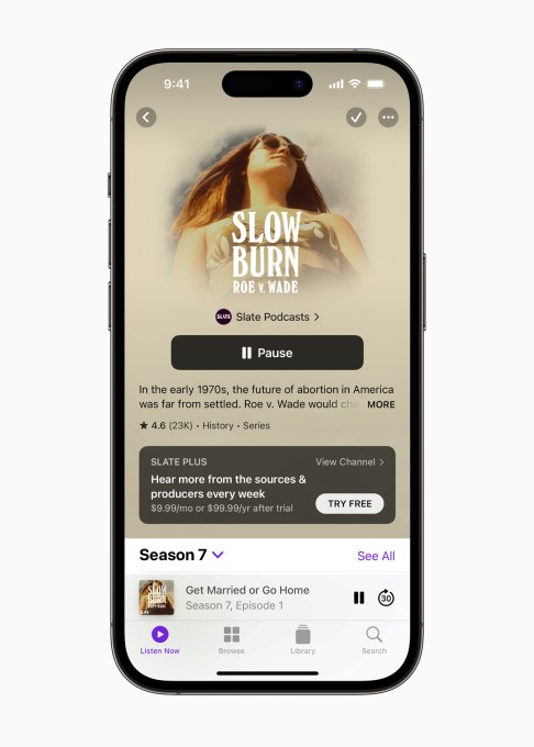 Apple said that “Slow Burn” is one of the all-time popular podcasts on the platform, clocking more than 100 million downloads. While the show is free, Slate offers bonus content from its catalog through its Slate Plus subscription available for $9.99 per month. The company is also offering a $99.99 per year annual subscription for a limited time.