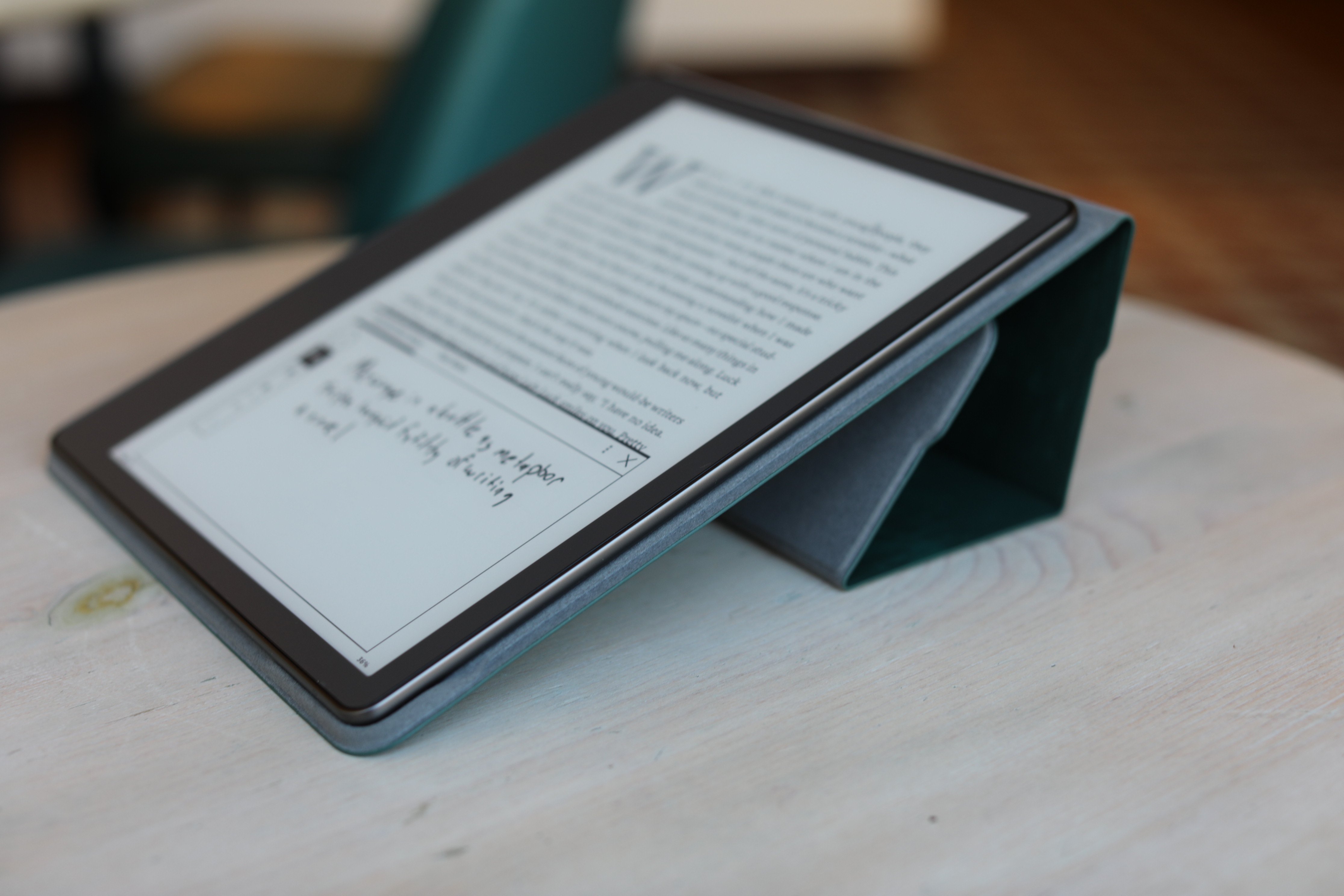 This starts with the design. The Scribe borrows a number of key elements from the Oasis. It’s amazing how much a flush glass display contributes to the overall premium feel. Also, like the Oasis, one of the side bezels is considerably larger than the other, presumably so you have a place to rest your hand while holding it that doesn’t trigger the touch display. Unlike the Oasis, however, there are no physical page-turn buttons on the surface, which feels like a missed opportunity.