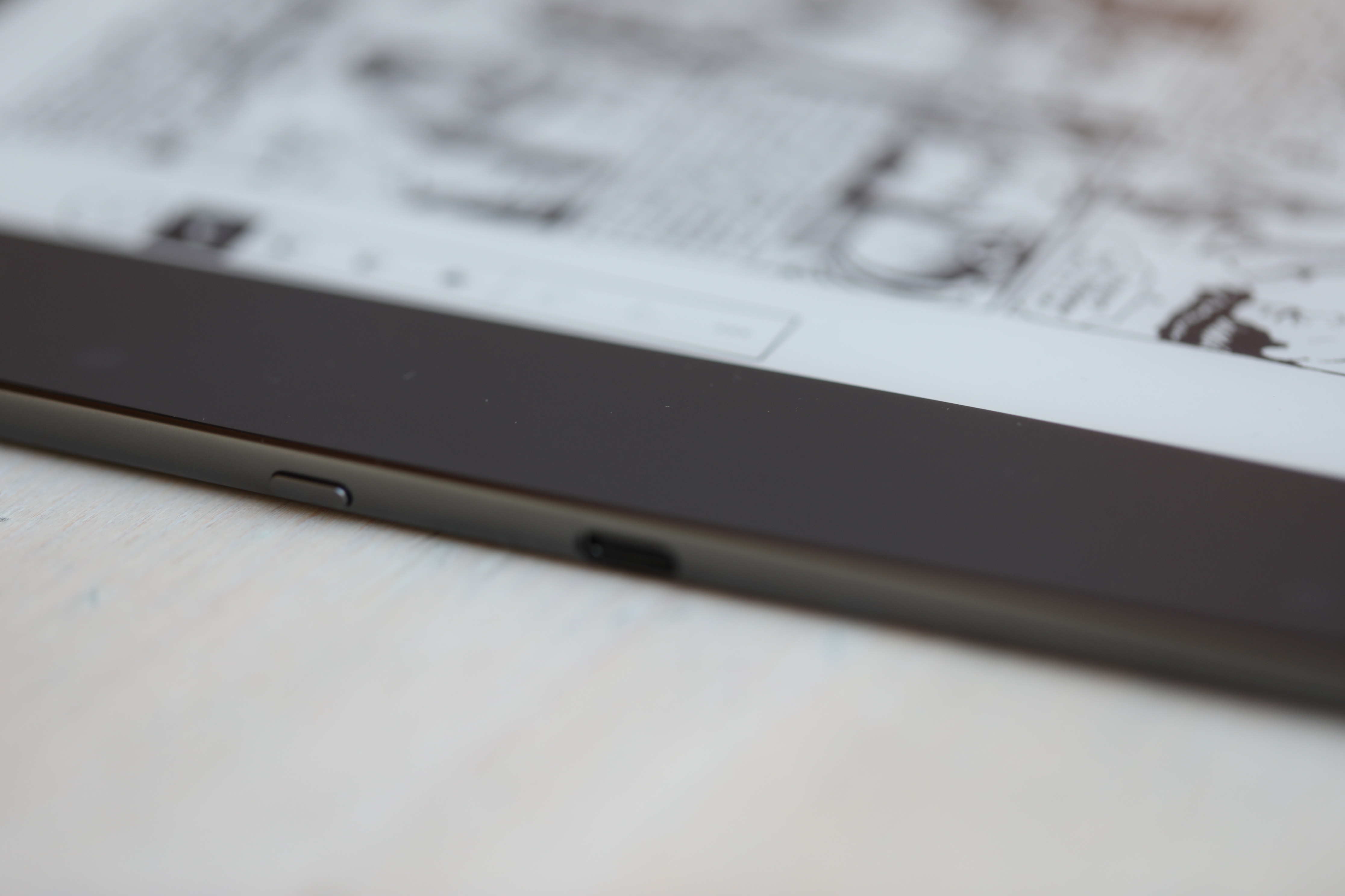 On the right side is the device’s single physical button. A single short press will wake up the device or put it to sleep. A longer press will pop up a dialogue box asking if you want to turn the screen off (for further battery saving) or restart it. There’s no option to power it off entirely. To the button’s right is the USB-C port.