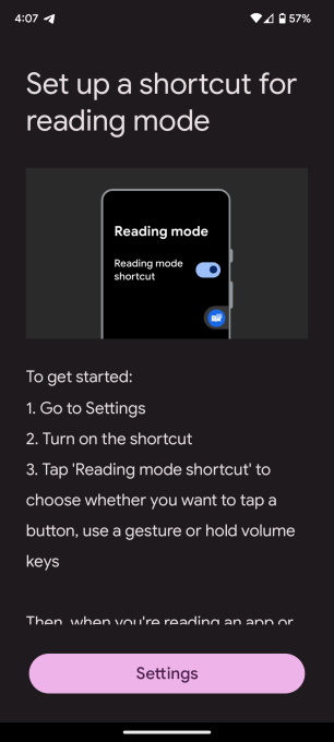 Google already offers a number of accessibility tools, including a screen reader with TalkBack and a built-in Braille keyboard. As the name suggests, Reading Mode has been specifically designed to read or listen to long text, such as online articles. It isn’t meant to read everything that is on the screen like buttons and their purposes.