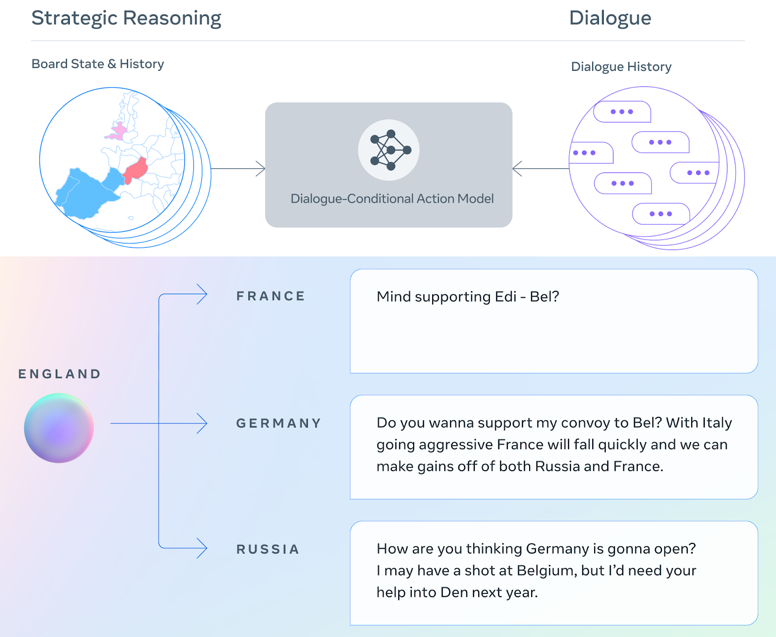 - Using the board state and current dialogue, make an initial prediction of what everyone will do.