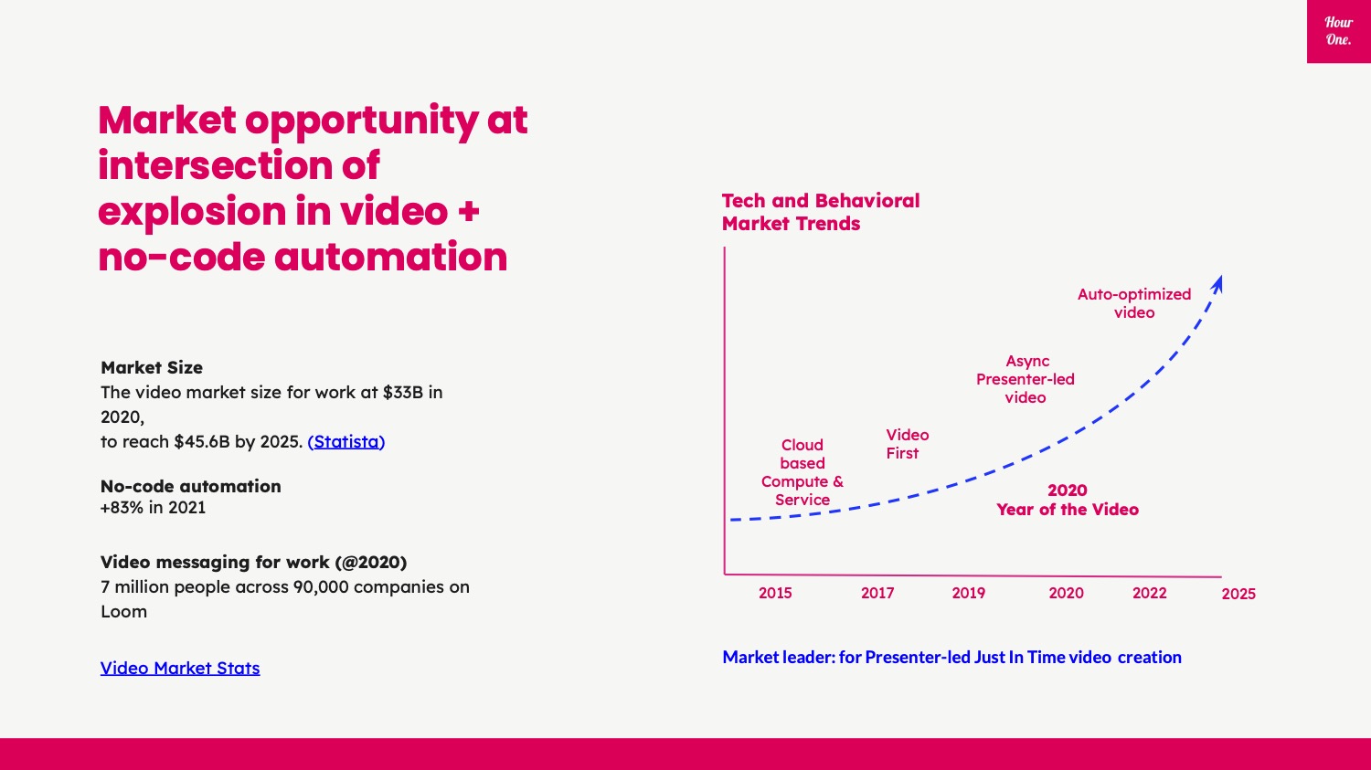 Apart from the great pun in the name for its product, this slide is jam packed with really good content, offering a really clear summary of the product complexity Hour One has already built through a simple, user-focused story. To make this slide even better, I’d have preferred that the story was benefits driven rather than feature driven, but it does a lot of heavy lifting as-is.