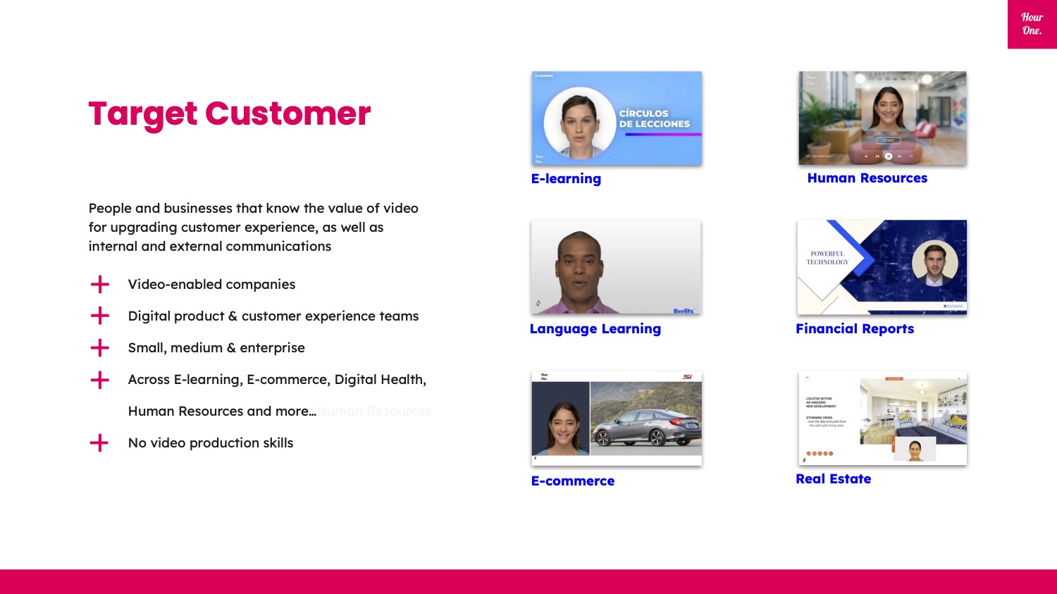 Obviously, I’m making up the numbers here, but as a founder, these are the kinds of slides where you can really show off how deep your market understanding is. Another approach might be to make it more benefits driven, connecting the customers with the use cases. “E-commerce uses Hour One to connect with customers” and “CFOs use Hour One to make their financial reports come to life.”