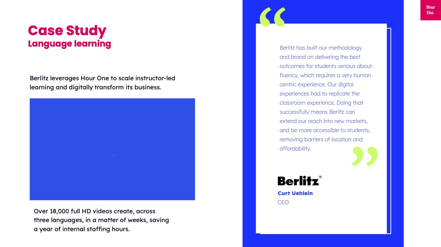 For a gold star, combine them for even deeper narratives: “Company X uses Hour One to make its internal training programs, resulting in a 35% increase in completion of new training initiatives.”