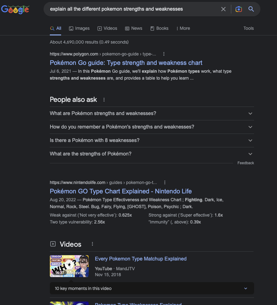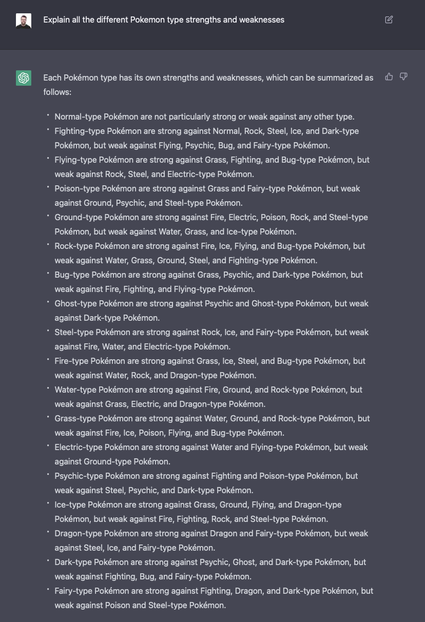 My own example of why I think this is so powerful is timely, if mundane: I asked ChatGPT to provide me with all the various Pokémon type strengths and weaknesses, and it delivered exactly what I always hope Google will every time I enter a Tera Raid in the new Pokémon Scarlet game and have to try to remember what counters what.