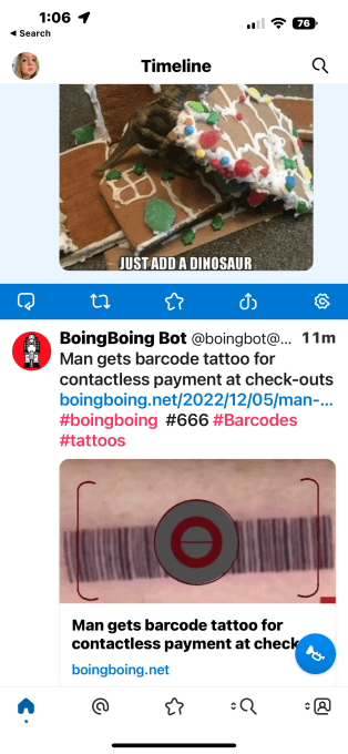 The app, called Ivory, is still in the initial stages of development, but will likely appeal to Tweetbot users who want an app that also offers quick access to key features — in this case, navigation buttons that take you to your home timeline, @ mentions, favorites, search and trends, and your own user profile. You can swap out some buttons for others if you prefer. For example, a long press on the search button lets you switch over to a statistics feature or another screen for configuring mute filters. In addition to helping users mute topics they don’t care about or find disturbing, the latter could also help older Mastodon users from having to constantly read about Twitter and Musk in their feeds — something that’s been a steady complaint since the Twitter exodus.